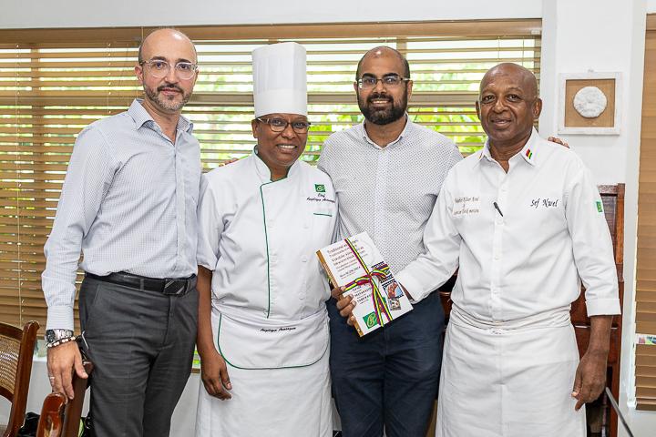 De gauche à droite: Arnaud Huck, Head of Commercial à Panagora, Chef Angélique Armoogum, Training Officer à l'Ecole Hôtelière, Yovan Jankee, Sustainability Manager chez Panagora et le Chef Noël Chelvan, auteur du livre