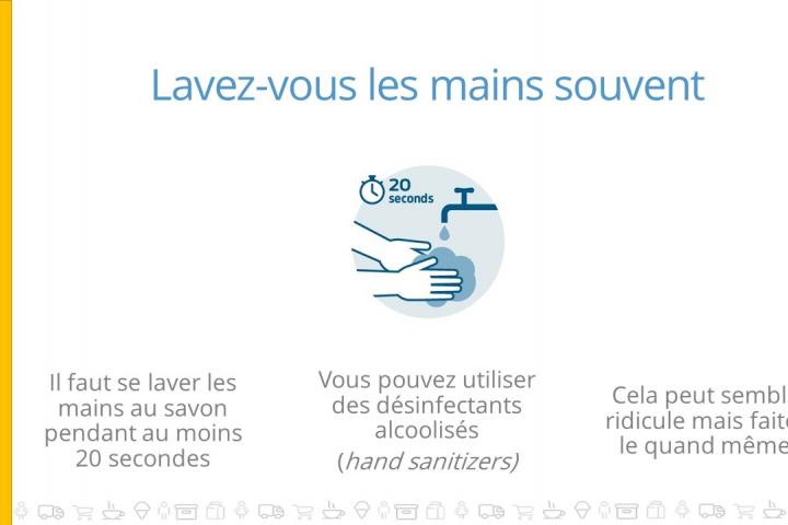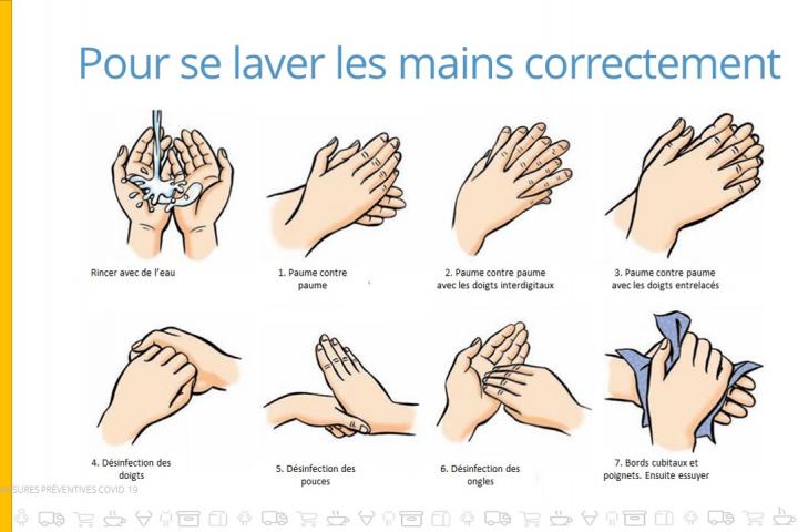 - Pas de contacts physiques : handshakes, se toucher le visage, etc.
