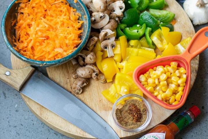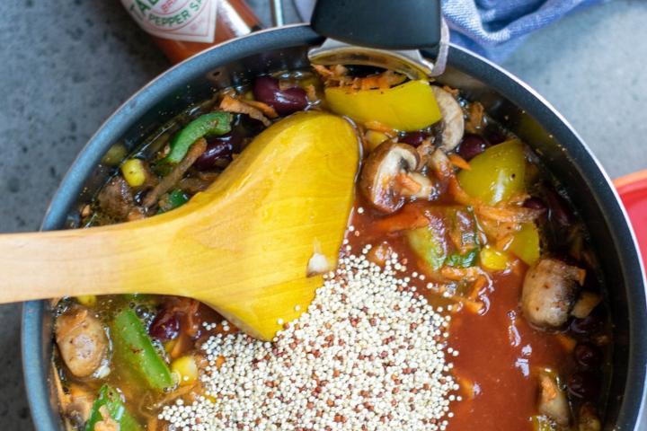 1. Chauffer l'huile dans une casserole  à feu moyen. Faire revenir l'oignon, l'ail, les poivrons et les champignons pendant environ 1 minute. Ajouter les haricots, le maïs, les carottes, les épices, la sauce au poivre Tabasco, le bouillon de légumes, la purée de tomates et le quinoa. Bien mélanger.