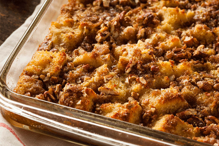 - Incorporez le lait évaporé, la vanille et le sel. Versez sur le pouding, saupoudrez de noix, et servir.