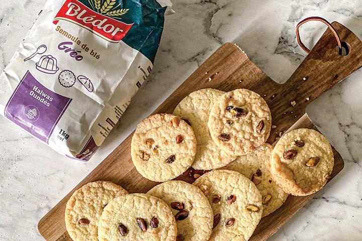 2. Tamisez tous les ingrédients secs (semoule de blé, poudre de cardamome, levure et sel) dans un bol séparé.