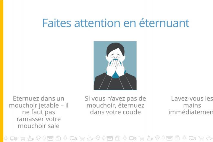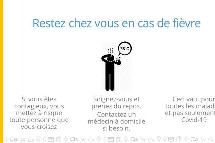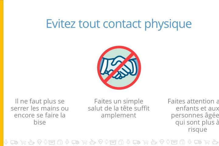 - Pas de contacts physiques : handshakes, se toucher le visage, etc.